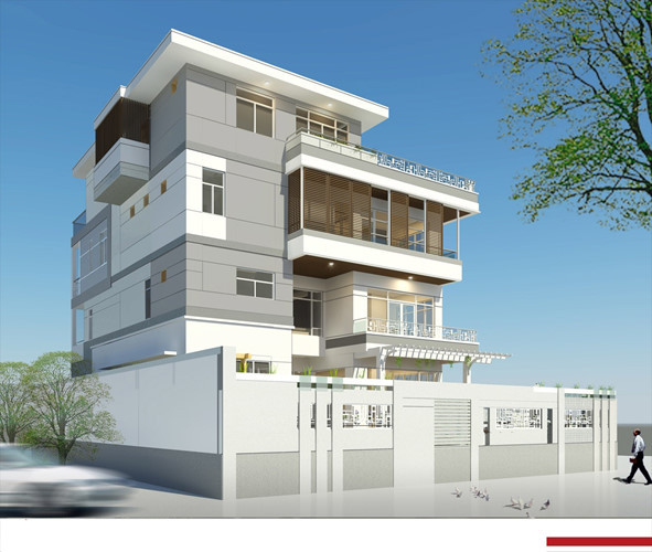 Biệt thự hiện đại 2 tầng đặc biệt ở cách sắp xếp các hình khối vừa tránh nắng hướng Tây bên hông trái, vừa đón gió và lấy sáng từ hướng Tây.