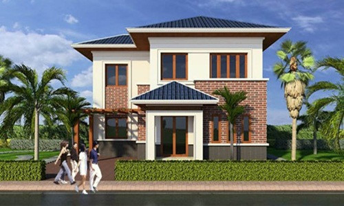 Ngôi nhà mang phong cách hiện đại, sử dụng các chi tiết đơn giản. Sân vườn rộng phía trước mặt, tạo chiều sâu, góc nhìn đẹp.