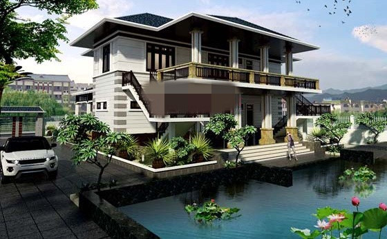Biệt thự 2 tầng nổi bật với kiến trúc độc đáo. Phía trước nhà là khu ao sen thơm mát, quanh nhà là khu sân lát gạch đen sạch sẽ.