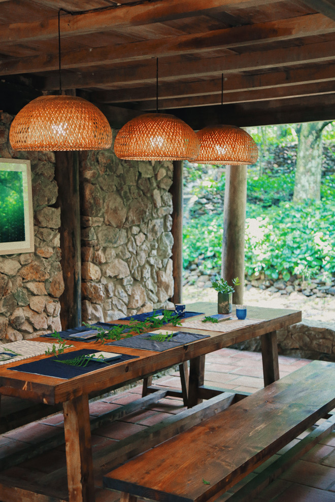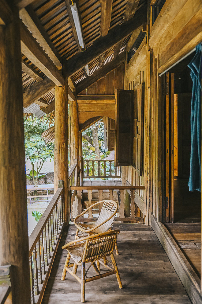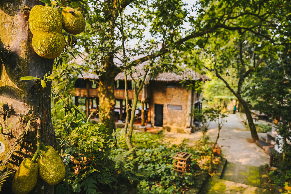 Toàn bộ khu nhà có 2 công trình lớn là nhà sàn và nhà ba gian với vật liệu chính là gỗ kết hợp đá ốp mặt ngoài.