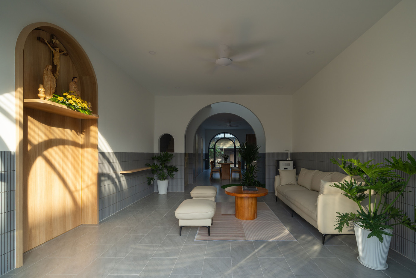 | Tầng trệt dành riêng cho các khu vực chung như phòng khách – nơi đặt bàn thờ tổ tiên tích hợp, bếp khu vực ăn uống và góc thư giãn. |