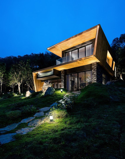 Dẫn lối vào sảnh là các bậc đá tự nhiên trên triền cỏ. Tường ốp gỗ và đá thô đem tới cảm nhận thân thiện, gần gũi với thiên nhiên của biệt thự nghỉ dưỡng cuối tuần theo phong cách Bắc Âu.