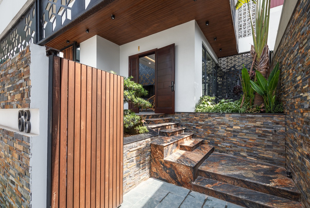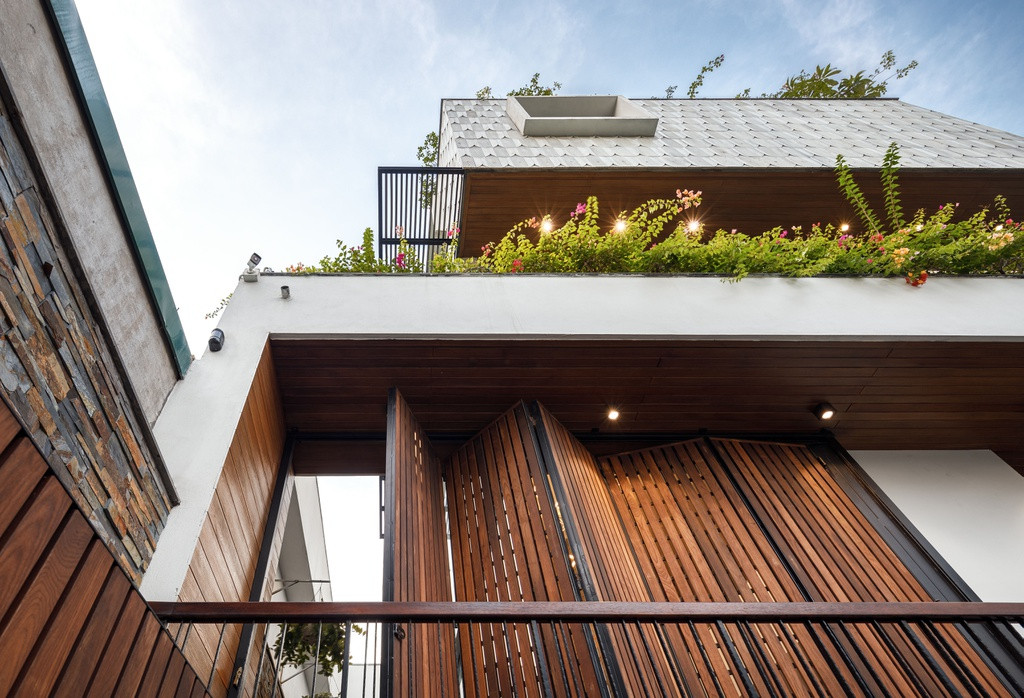 Các phòng ngủ được bố trí theo hướng Đông để tránh hấp thụ nhiệt vào buổi chiều nhưng vẫn đón nắng gió Nam vào buổi sáng. Các phòng phụ trợ sang hướng Tây. Hệ thống cửa xếp bằng lam gỗ thoáng được thiết kế để vận chuyển khối khí nóng trên trần tầng 2 vừa đảm bảo an ninh, vừa thông gió hiệu quả cho căn nhà.