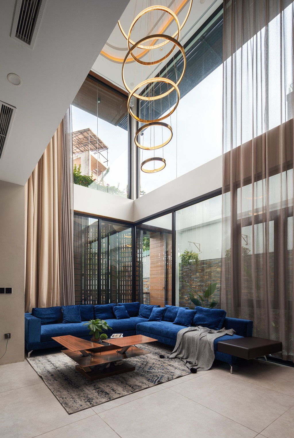 Điểm nhấn của căn nhà là khoảng thông tầng hướng Tây và một bể bơi khá lớn ở tầng hầm. Hai không gian này được kết nối bởi một cầu thang xoắn.