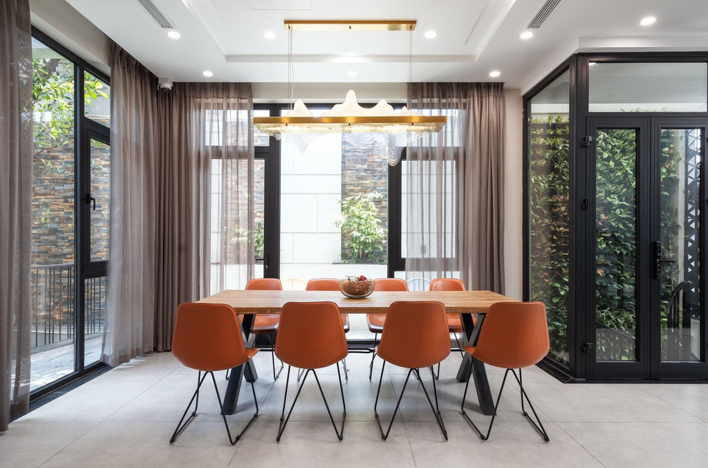 Các chức năng của căn nhà như phòng khách, phòng bếp, khu vực bàn ăn ở tầng 1 được liên thông với nhau tạo nên không gian rộng rãi hơn diện tích thực.
