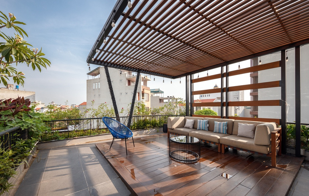 Sân thượng với hàng ghế dưới mái hiên gỗ cũng trở thành một nơi giúp các thành viên trong gia đình thư giãn và biến căn nhà thực sự là một "resort tại gia".