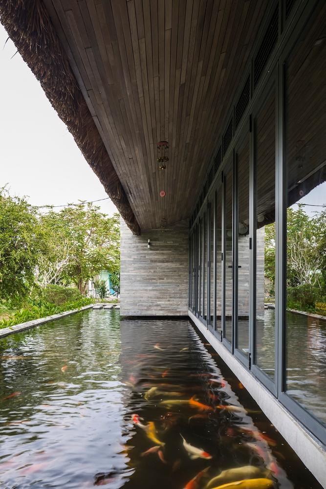 | Từ đó, công trình trong ảnh ra đời. Ngôi nhà được thiết kế với 5 khối riêng biệt và sắp xếp ngẫu nhiên dưới một mái tranh lớn ngay cạnh hồ cá Koi. Nhóm kiến trúc tận dụng sự chia cắt của các khối không gian hình học của công trình để tạo ra các góc nhìn đa dạng từ bên trong và bên ngoài cũng như để ngôi nhà được thông gió và có nhiều ánh sáng tự nhiên vào ban ngày. |