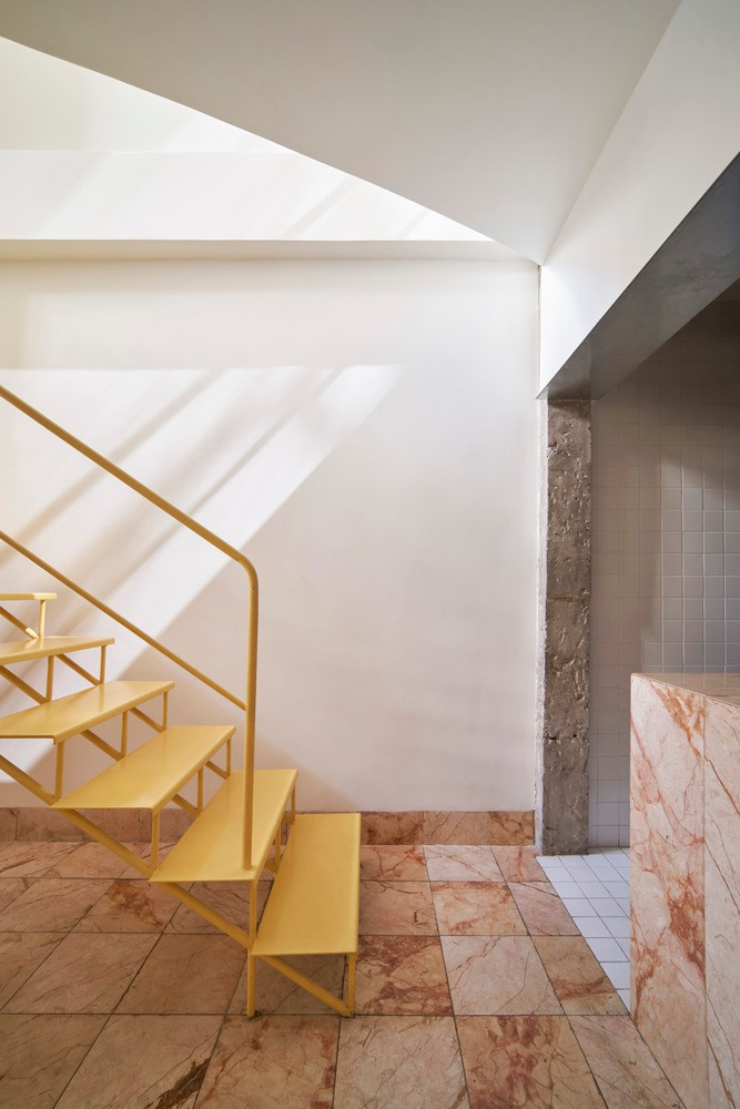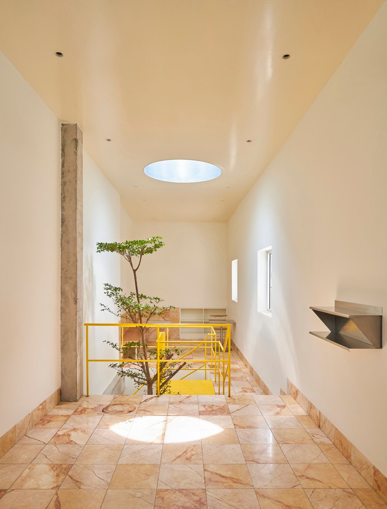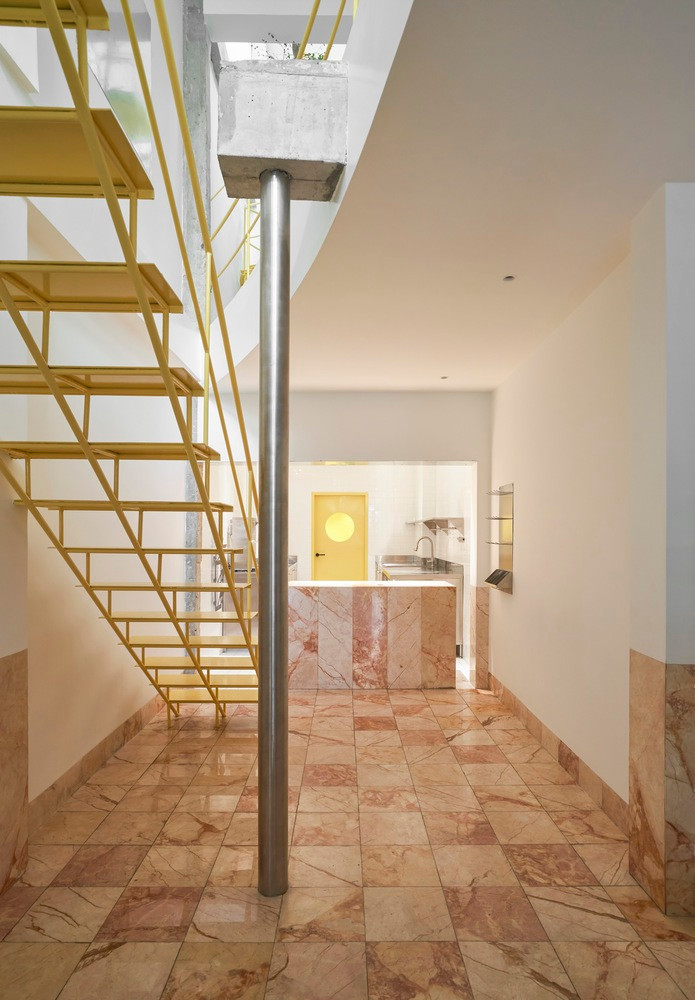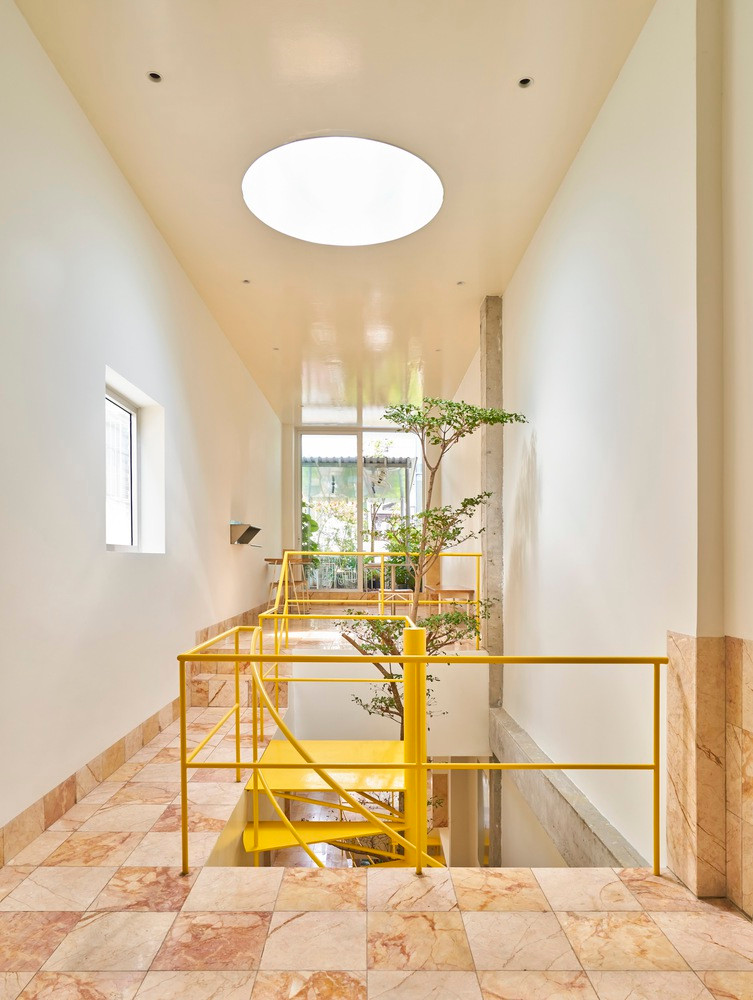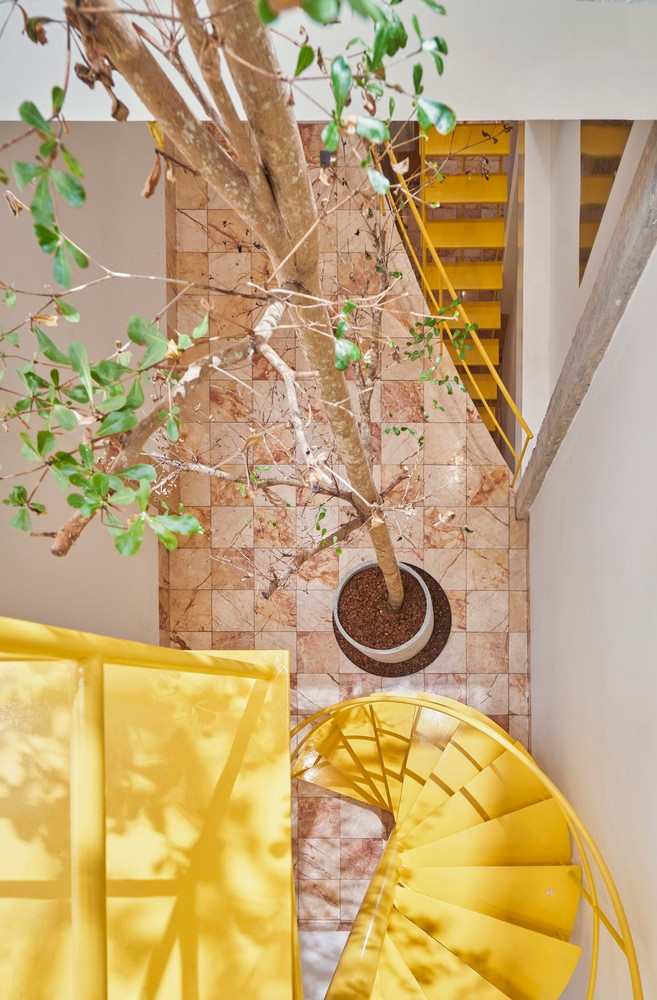 Sau cải tạo, giếng trời đã làm rất tốt chức năng của nó, bóng nắng đổ trên các mảng tường và cầu thang xoắn ốc sơn màu vàng tươi sáng kết hợp cùng gạch lót màu hồng cam tạo nên không khí tươi mới và ngọt ngào cho ngôi nhà.