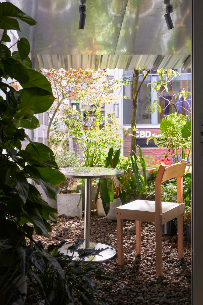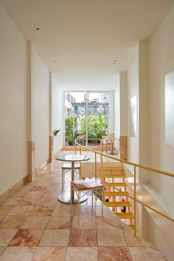 Kết hợp với cầu thang là khoảng thông tầng được bố trí thêm cây xanh, vừa tạo điểm nhấn cho trục đứng vừa tạo bất ngờ thú vị cho những vị khách đến cửa hàng.