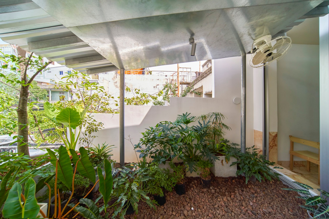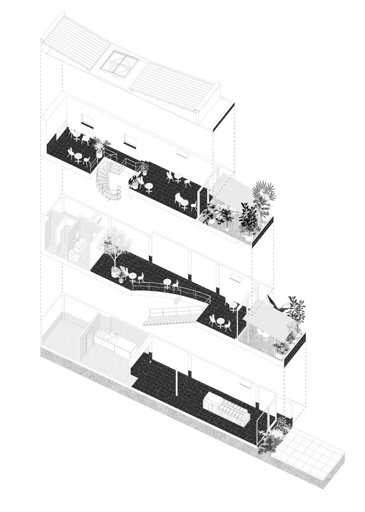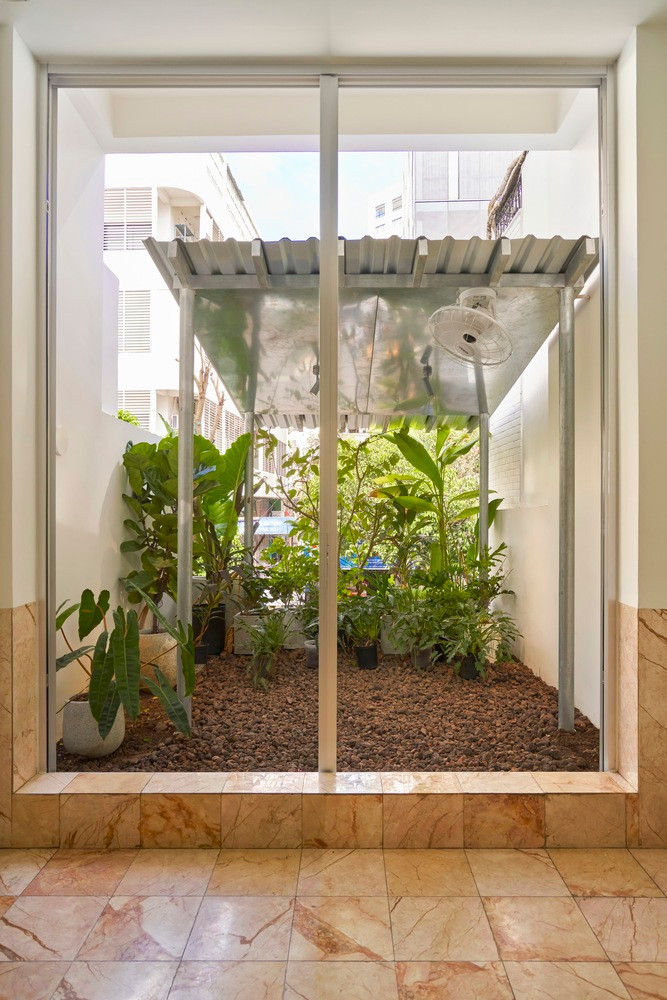 Với mục tiêu đưa ánh sáng và gió trời tự nhiên vào không gian nhà, biến nhà phố thiếu sáng, bí bách trở thành nơi kinh doanh thoáng đãng cùng với các khoảng nghỉ kết nối với tự nhiên: giếng trời, khoảng thông tầng và vườn ban công được kiến trúc sư đưa vào thiết kế.