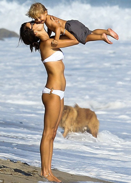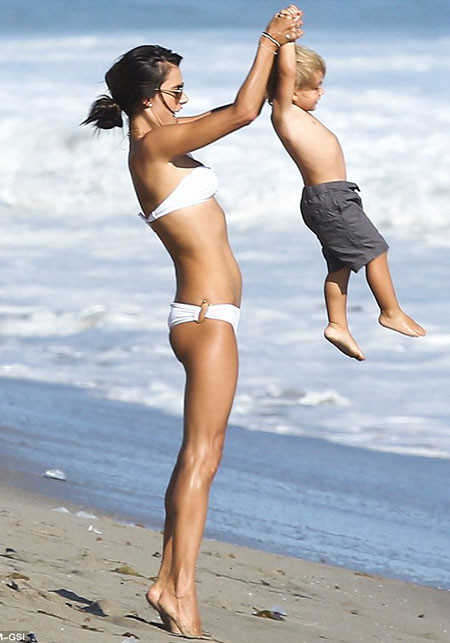 Siêu mẫu Brazil Alessandra Ambrosio xuất hiện trên bãi biển cùng cậu con trai Noah, 2 tuổi. Cậu nhóc thích thú khi được mẹ cưng nựng và bế bổng.