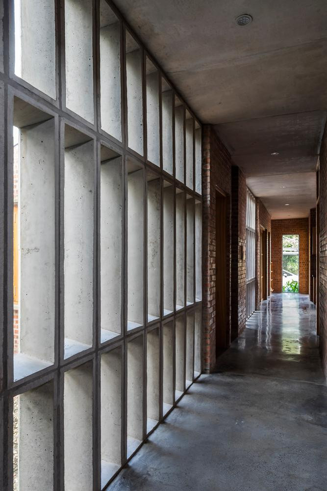 | Các bức tường được làm bằng gạch đỏ lộ thiên, trong khi tất cả các yếu tố khác như cửa ra vào, khung cửa sổ và đồ nội thất được làm bằng gỗ xoan. |