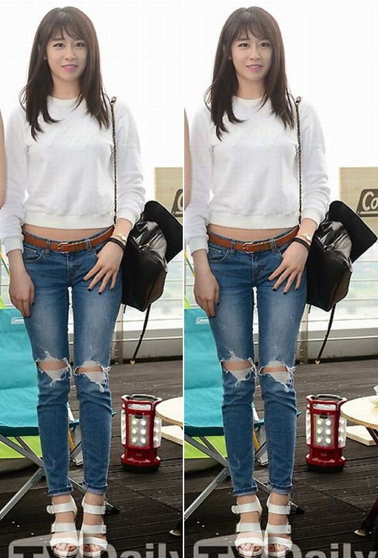 Đi học, đi chơi hay mua sắm... thì set đồ gồm áo nỉ trắng dáng lửng, quần jeans rách, xăng đan, túi đeo vai màu đen giống Ji Yeon (T-ara) đều hợp mốt.