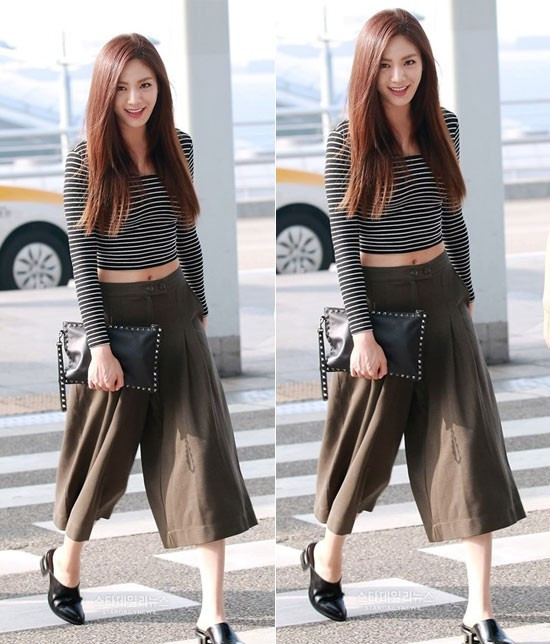 Nana (After School) chẳng khác gì siêu mẫu với set đồ bao gồm quần lửng ống rộng và áo crop top.