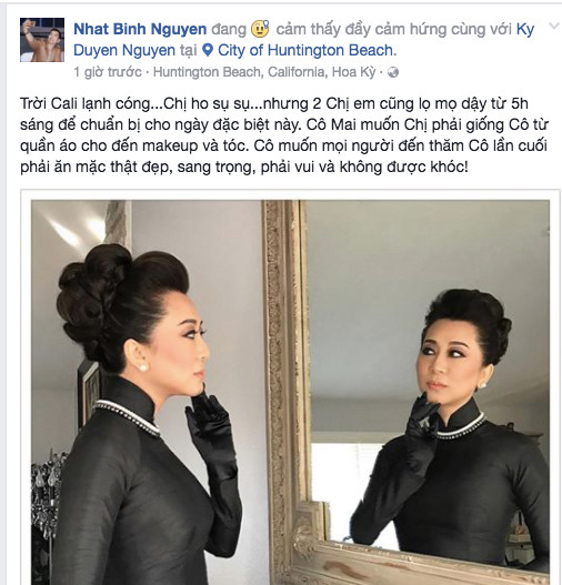 Được biết, chuyên gia trang điểm Nhật Bình đang có mặt với MC Kỳ Duyên tại tư gia của cô ở California, Mỹ để chuẩn bị cho đám tang của bà Tuyết Mai.
