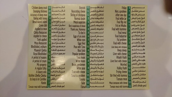 Trong thực đơn của một khách sạn ở A-rập Saudi có những món như “Thứ Sáu” (Friday), “Không thành vấn đề” (Not a problem), “Kim loại hôi” (Foul metal), “Ghế sofa xa xỉ” (A luxury sofa)…, khiến cho một du khách đang ở đây “bó tay toàn tập”. Người này đành chụp ảnh menu, gửi cho bạn mình đang ở Canada. Người bạn này lại phải đăng lên Twitter của mình (@vladadraws), với hy vọng ai đó có thể dịch giúp để bạn mình còn gọi thức ăn.