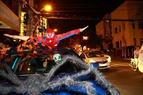 Xuất hiện trên đường phố Sài Gòn trong đêm, chiếc xe thu hút không ít sự chú ý của người đi đường, đặc biệt hai người đi trên xe còn được hóa trang thành nhân vật “Spider Man” nổi tiếng, người lái xe thì đeo chiếc mặt nạ khá “kinh dị”.