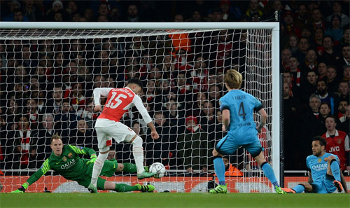 Trên thực tế, trận đấu có thể đã diễn ra theo một chiều hướng hoàn toàn khác nếu Arsenal tận dụng được cơ hội ngon ăn ở phút 22. Tình huống diễn ra khi hàng thủ Barca tỏ ra lúng túng sau cú sút của Hector Bellerin. Khi bóng bật ra, trong tư thế hoàn toàn trống trải, Oxlade-Chamberlain bỏ lỡ cơ hội bằng vàng với pha sút chìm vội vã thay vì nhắm vào góc cao. Đây cũng là tình huống nguy hiểm duy nhất mà Arsenal tạo được trong hiệp một.