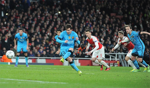 Bàn phá thế quân bình có thể đã gây ảnh hưởng xấu đến tâm lý thi đấu của Arsenal. Không lâu sau đó, hàng thủ đội chủ nhà tỏ ra thiếu tập trung dẫn đến quả phạt đền. Đầu tiên là pha đỡ bóng vụng về của Mertesacker, và sau đó là tình huống phạm lỗi rõ ràng của Flamini đối với Messi trong vòng cấm. Có cơ hội trên chấm 11m, Messi không chuyền cho Suarez như những gì diễn ra trong trận thắng Celta Vigo mới đây, mà khéo léo đánh lừa Cech để ấn định chiến thắng 2-0.