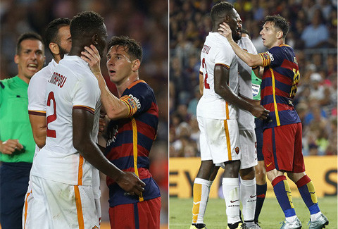Tình huống va chạm giữa Lioel Messi và Mapou Yanga-Mbiwa diễn ra ở phút 34 của trận đấu khi Barca đang dẫn trước Roma 1-0. Sau khi trọng tài Javier Estrada thổi phạt ở tình huống Neymar nhận bóng, Messi vẫn cố tình đi bóng qua trung vệ Yanga-Mbiwa và đây là khởi nguồn của vụ va chạm.