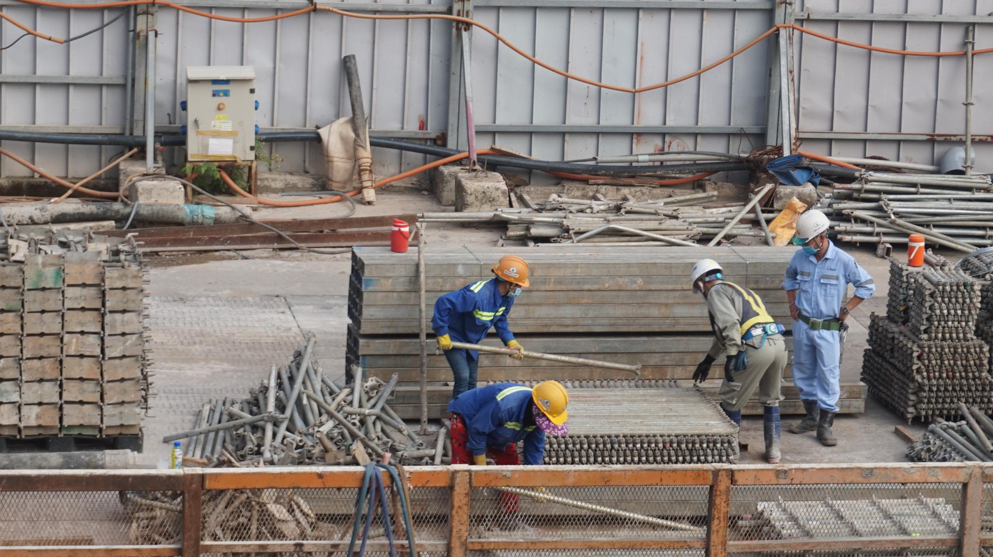 | Công nhân đang gấp rút thi công trên tuyến Metro số 1. Ảnh Chang Chang |