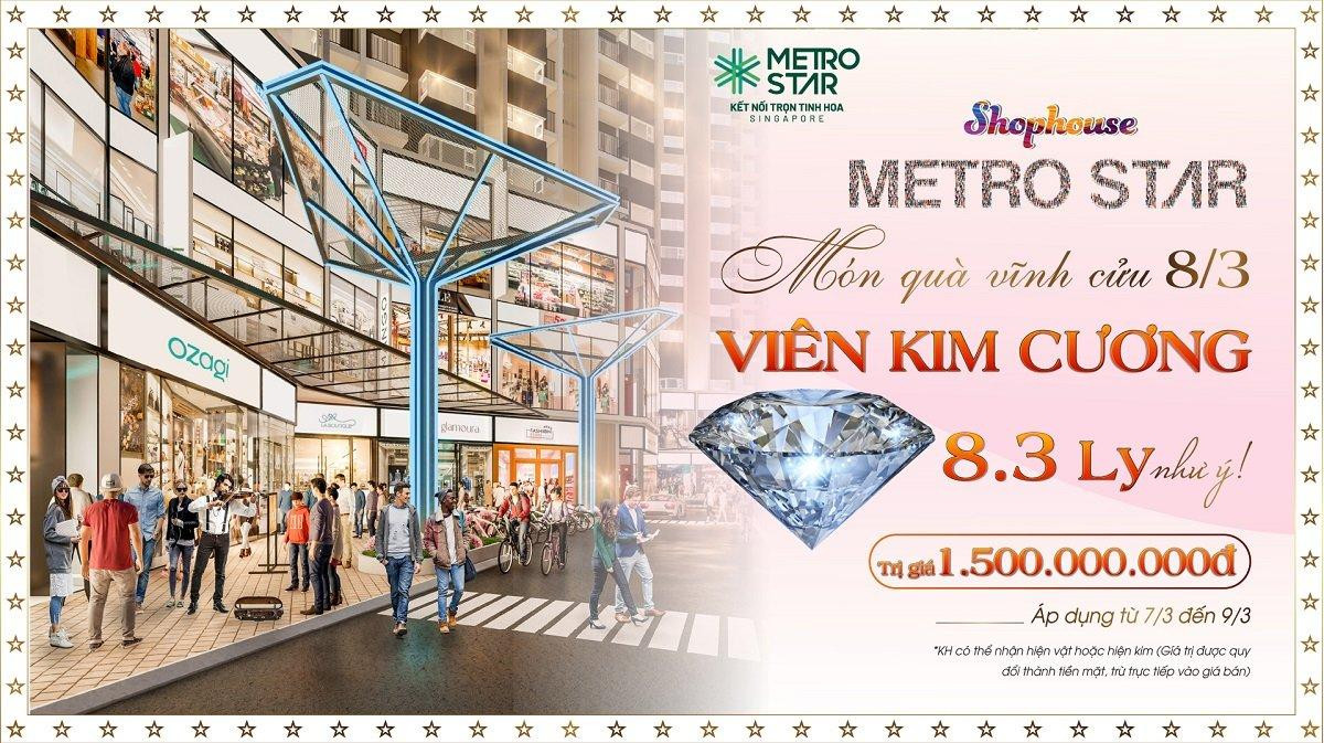 Chương trình chỉ áp dụng duy nhất trong 3 ngày từ 07 - 09/03/2022, các nữ khách hàng khi chốt deal thành công shophouse Metro Star sẽ được tặng rất trang trọng 1 viên kim cương 8.3 ly, trị giá lên đến 1,5 tỷ đồng. Metro Star quả là ưu ái phụ nữ trong khi sản phẩm shophouse dọc ga Metro vốn rất khan hiếm nguồn cung trên thị trường.