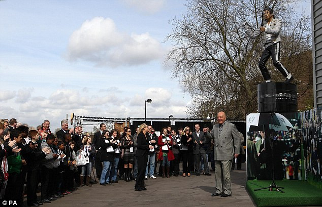 | Mohamed Al Fayed và bức tượng vua nhạc Pop ở cổng sân vận động. |