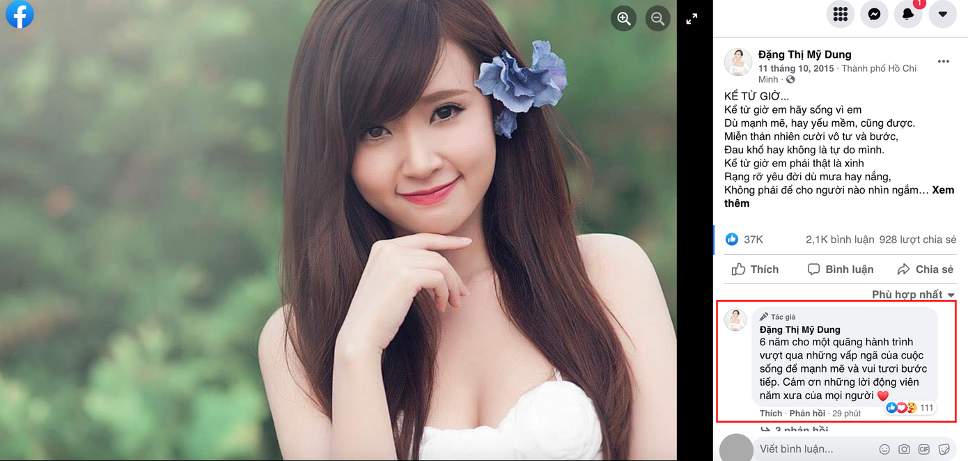 Những tưởng quá khứ đã ngủ yên thì mới đây, Midu viết bình luận trên một bài đăng của chính cô từ 6 năm trước, khi còn đang đau khổ vì thất tình. Midu tâm sự: "Sáu năm cho một quãng hành trình vượt qua những vấp ngã của cuộc sống để mạnh mẽ và vui tươi bước tiếp. Cảm ơn những lời động viên năm xưa của mọi người" cho thấy cô đã vượt qua được cú 'sốc' trước đây và đang rất hài lòng với hiện tại.