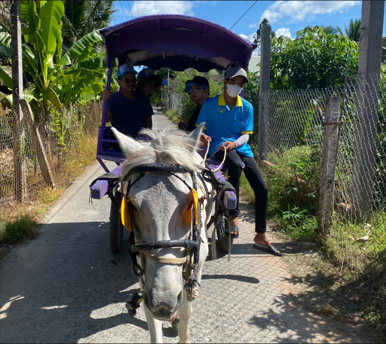 ● 10h00: Tàu đón Quý khách xuôi theo dòng Sông Tiền đến Bến Tre tham quan tìm hiểu quy trình làm kẹo dừa, thưởng thức kẹo dừa. Tiếp tục Quý khách đi xe ngựa tham quan đường làng của Bến Tre. Thưởng thức đặc sản đuông dừa (chi phí tự túc).