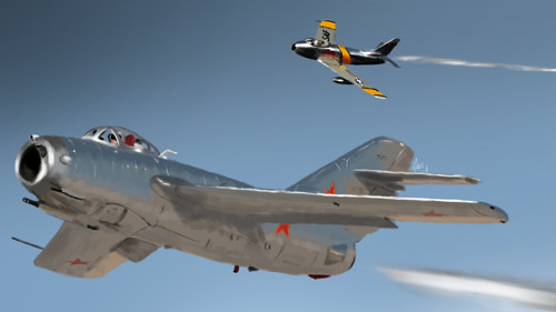 Các trận không chiến nổi tiếng nhất giữa Mig-15 và F-86 diễn ra ở khu vực "Mig Alley" ở miền bắc Triều Tiên. Tại đây, các tiêm kích này thường đọ sức tay đôi trong các trận chiến một mất một còn, đánh dấu sự ra đời của hình thức không chiến đầu tiên giữa các máy bay phản lực trên thế giới.