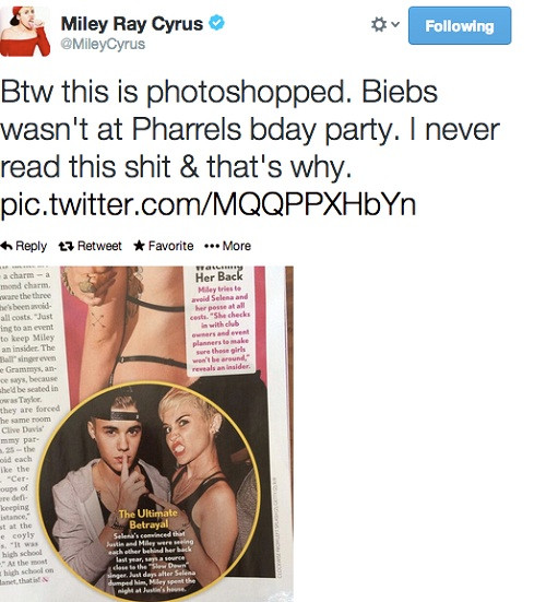 Tuy nhiên, Miley Cyrus đã chính thức phủ nhận việc này trên Twitter. Nữ ca sĩ “Adore You” cho rằng : bức hình mình chụp chung với Justin đã bị chỉnh sửa bằng phần mềm photoshop, cô khẳng định Justin Bieber không có mặt ở bữa tiệc sinh nhật của Pharrel.