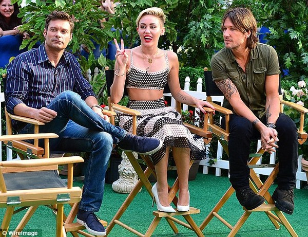 Khi xuất hiện trên chương trình cùng Ryan Seacrest và cựu giám khảo American Idol - Keith Urban, ngôi sao 20 tuổi mặc một trang phục khác cũng khá sexy với váy dài và áo hai dây lửng. Thời gian gần đây, Miley rất chuộng gu thời trang 'mát mẻ' và liên tục thả rông ngực.