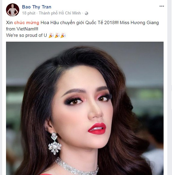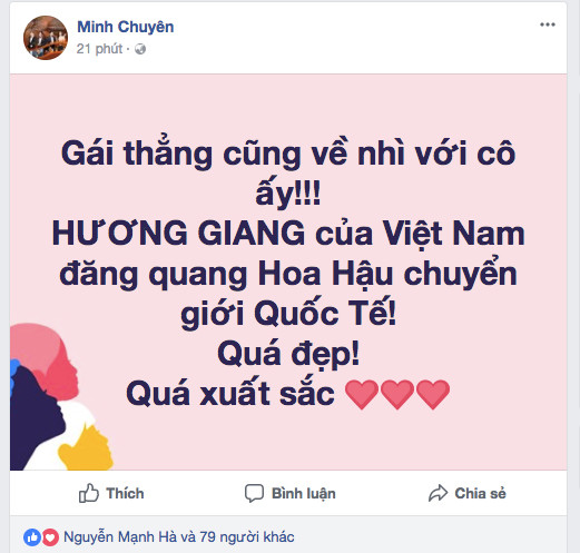 Ngay sau khi Hương Giang Idol giành ngôi Hoa hậu chuyển giới 2018, rất nhiều sao Việt đã đăng đàn giành lời chúc mừng cho cô. Nữ ca sĩ Minh Chuyên thốt lên: "Gái thẳng cũng về nhì với cô ấy! Hương Giang của Việt Nam đăng quang Hoa hậu chuyển giới quốc tế. Quá đẹp! Quá xuất sắc!".