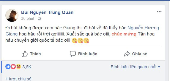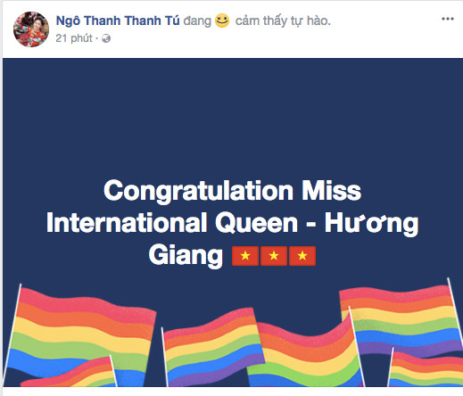 Nữ ca sĩ Thu Minh gửi lời chúc mừng Hương Giang trên trang cá nhân.