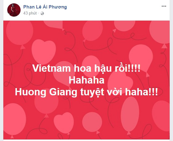 Ca sĩ Phan Lê Ái Phương phấn khích khi Hương Giang lên ngôi Hoa hậu.