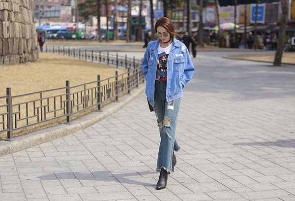 Tuần lễ thời trang Seoul (Seoul Fashion Week) diễn ra từ ngày 21-26/3/2016, tại trung tâm Dongdaemun Design Plaza, nhà máy Daesun Flourmill ở Mullaedong (Seoul, Hàn Quốc). Theo thường niên, đây là tuần lễ giới thiệu các mẫu thiết kế xuân hè 2016 với sự xuất hiện của 38 thương hiệu thiết kế và 3 công ty thời trang. Sự kiện thu hút đông đảo sự quan tâm của đông đảo công chúng và báo giới. Trong ảnh: Ngày đầu tham dự, Minh Hằng chọn chất liệu jeans trẻ trung cùng mẫu quần loe đang thịnh hành.