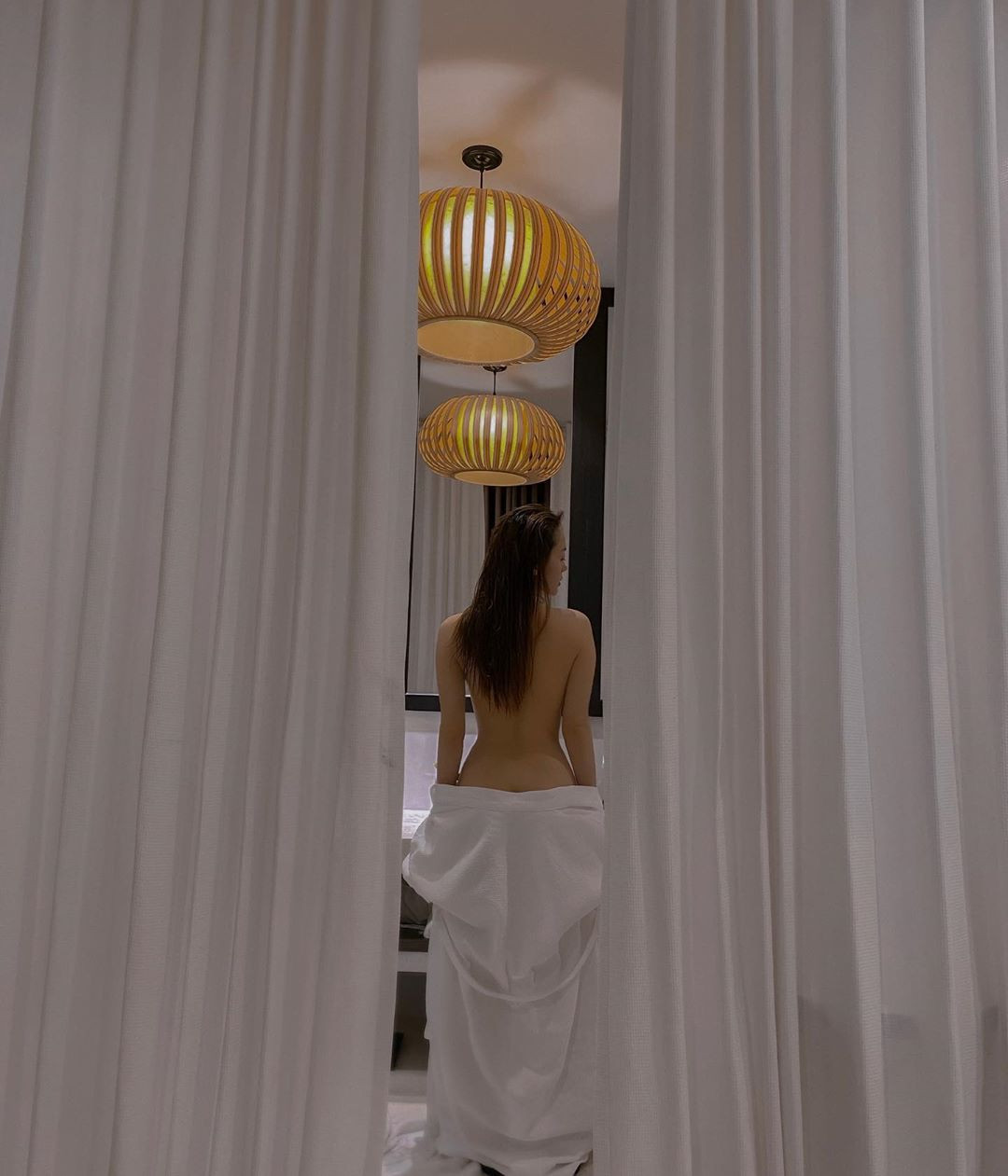 Theo đó, Minh Hằng chia sẻ bức ảnh mình đang bán nude phần trên, quay lưng lại trên Instagram và không quên chú thích: "Lâu lâu táo bạo để về già có cái chậc lưỡi. Bà hồi xưa cũng oanh liệt lắm mấy đứa".
