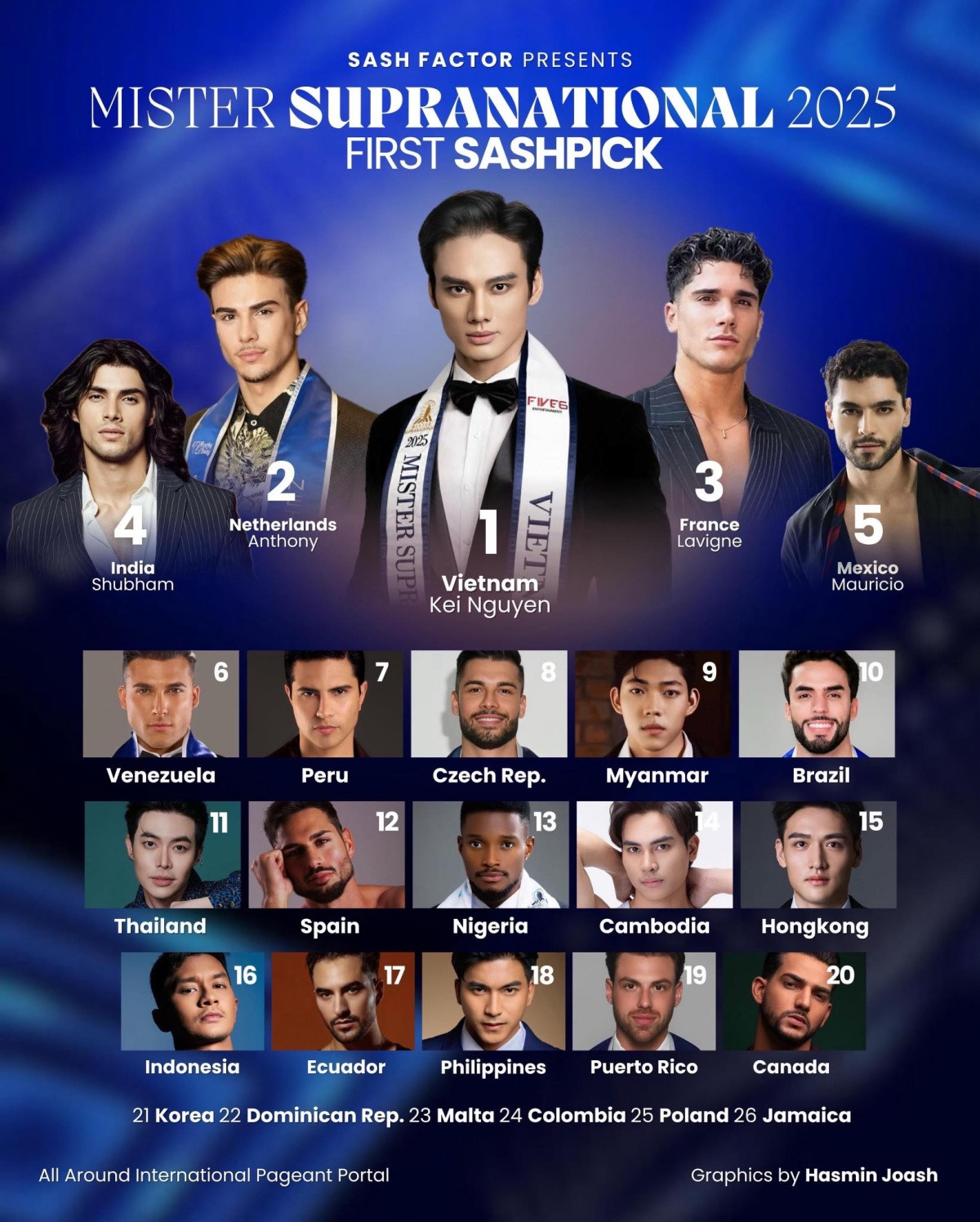 Mới đây chuyên trang nhan sắc Sash Factor đã đưa ra bảng dự đoán đầu tiên về cuộc thi Mister Supranational 2025 và người mẫu Nguyễn Minh Khắc - đại diện Việt Nam - được xếp hạng đầu tiên trong bảng dự đoán này.