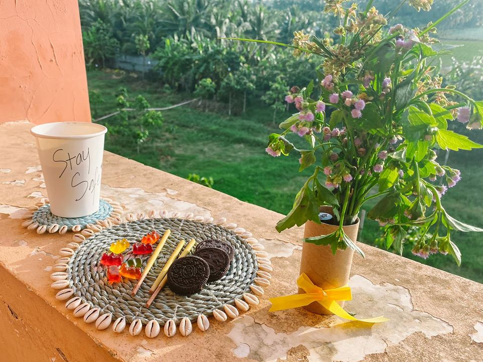 Chỉ với vài chiếc bánh quy cùng với một lọ hoa tự chế và cốc nhựa dùng để đựng trà, Minh Tú đã có một khung ảnh sống ảo ấn tượng.