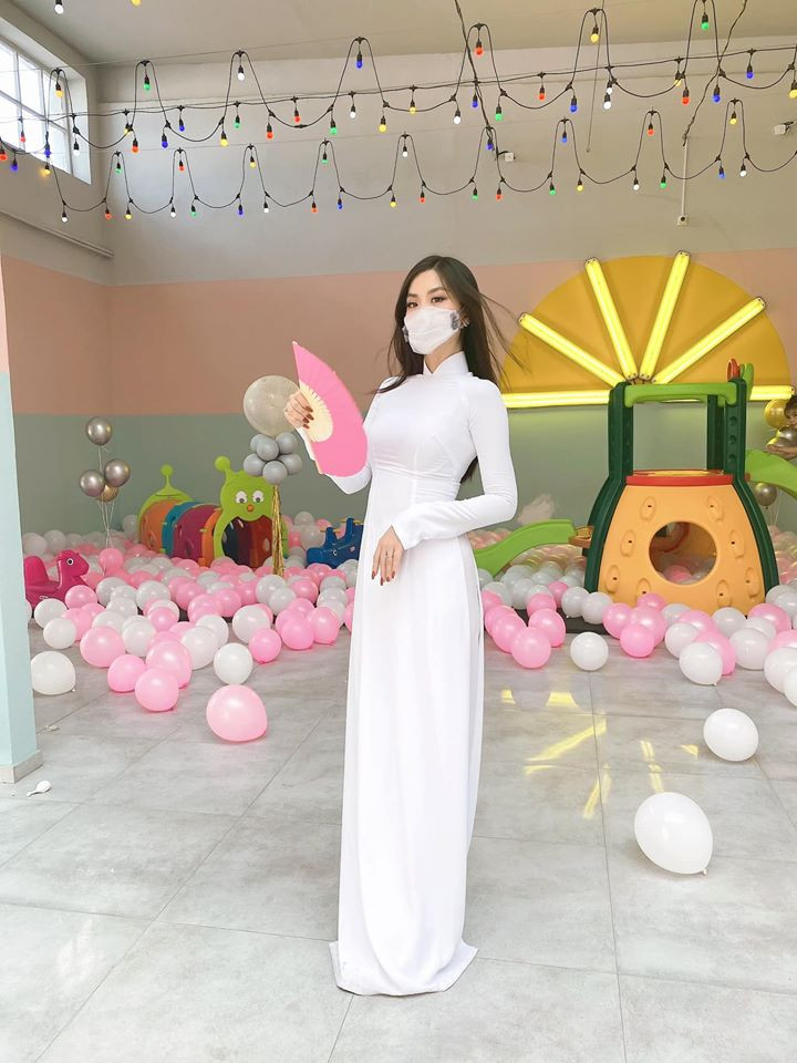 Người đẹp mặc áo dài trắng thướt tha nhưng vẫn đeo khẩu trang để phòng dịch.