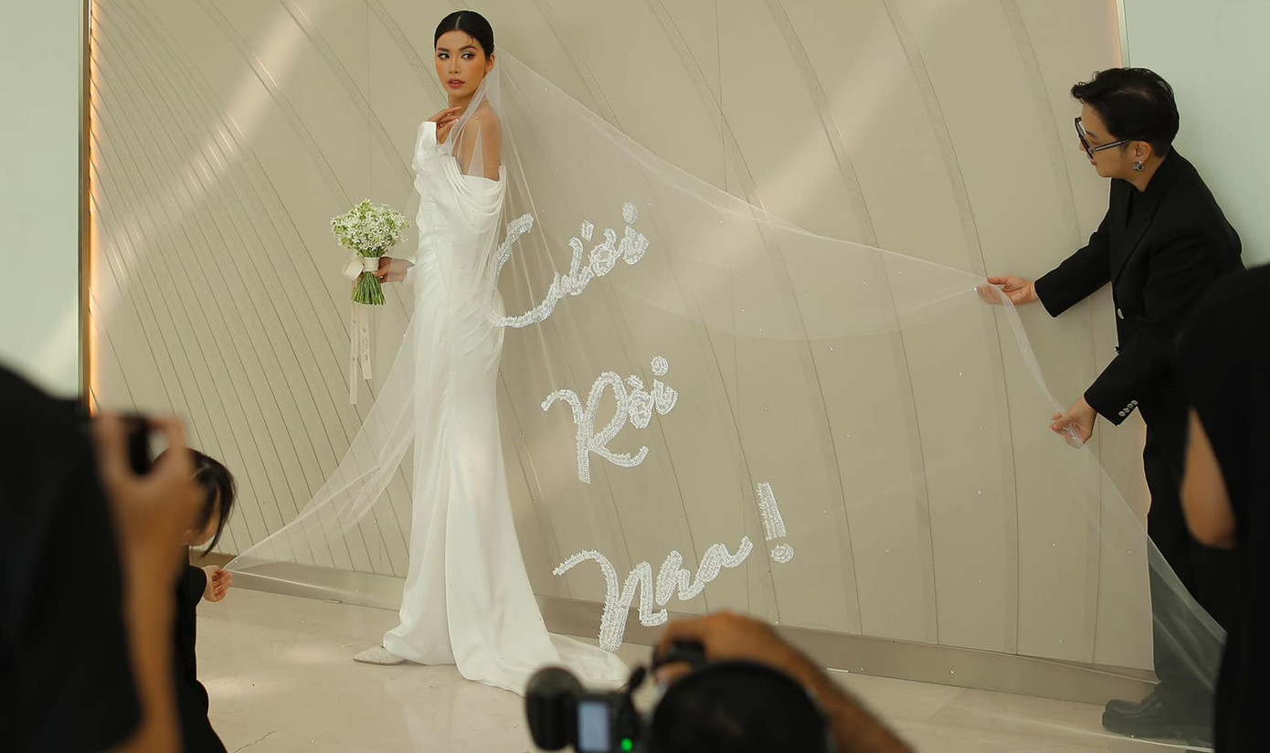 Ngoài ra, Minh Tú đội khăn voan dài 4 m thêu dòng chữ “Cưới rồi nha”, đường viền voan là những câu hỏi như “Bao giờ lấy chồng”, “Sao chưa lấy chồng”, “Khi nào bà lấy chồng”. Minh Tú cho biết cô muốn giữ lại những lời nói đầy quan tâm này làm kỷ niệm khi bước sang trang mới cuộc đời.