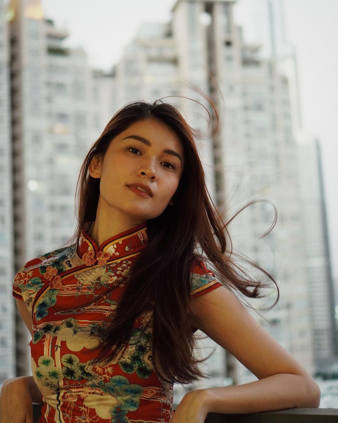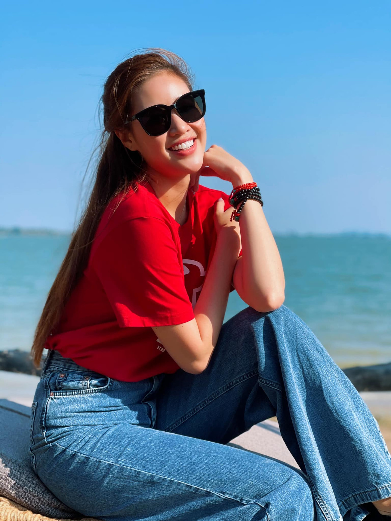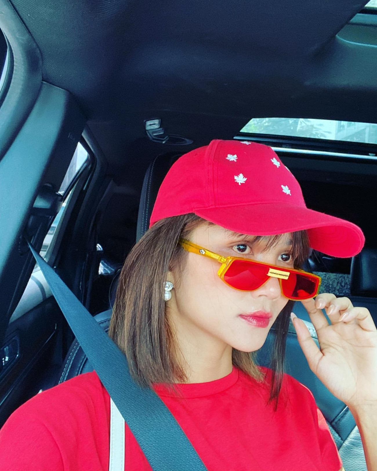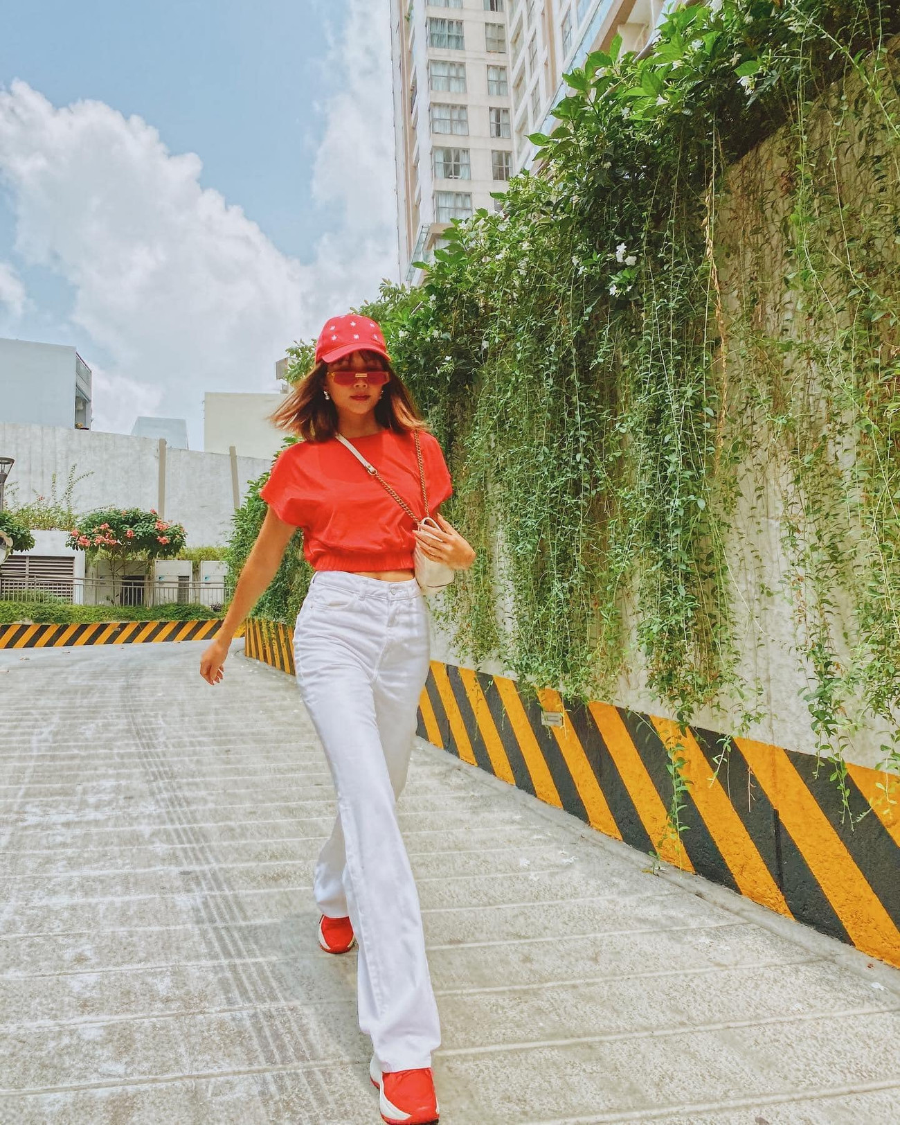 Hoa hậu H'Hen Niê xuống phố ngày mùng 4 Tết với set đồ tông màu đỏ-trắng nổi bật.