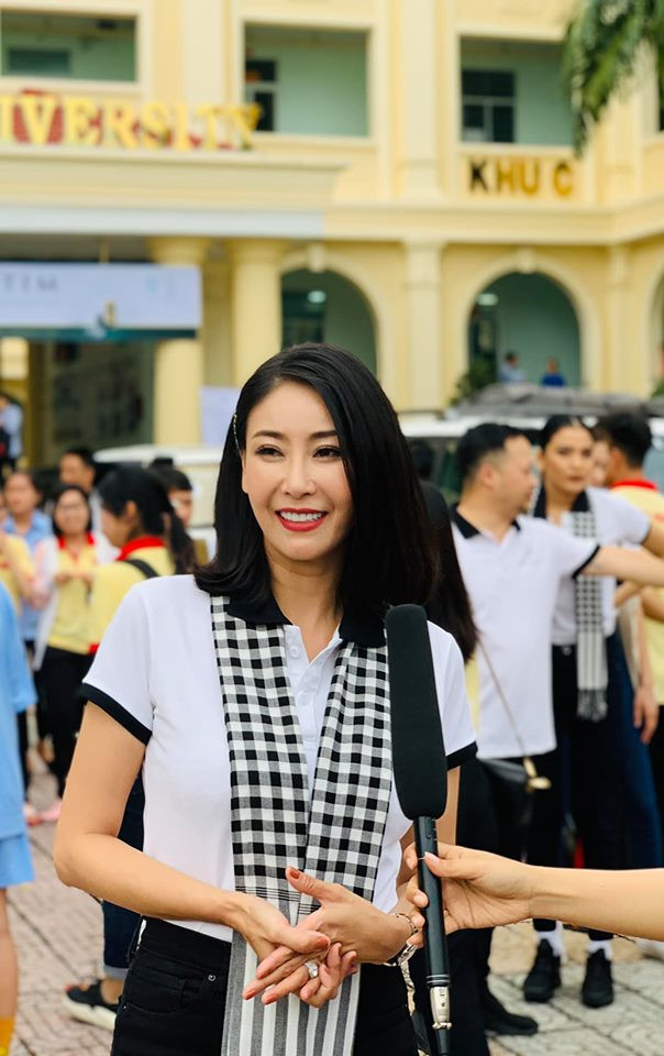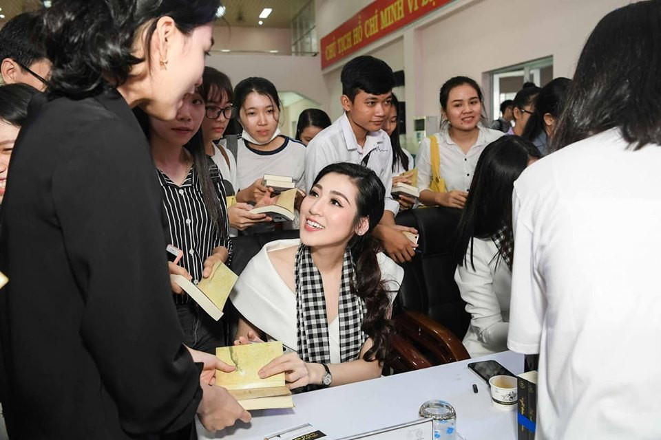 Hoa hậu Hà Kiều Anh như được trở lại thời học sinh khi đến giao lưu và tặng sách cho các bạn sinh viên tại Đại học Tây Đô.