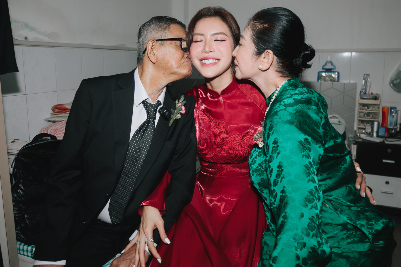 Theo lời kể của Minh Tú, khi thợ đến may đồ vét để chuẩn bị cho lễ đính hôn, ba của cô nói: “Ba sắp mất rồi, lấy lại đồ cũ bận được rồi”. Minh Tú nghẹn ngào xúc động không kiềm được nước mắt.