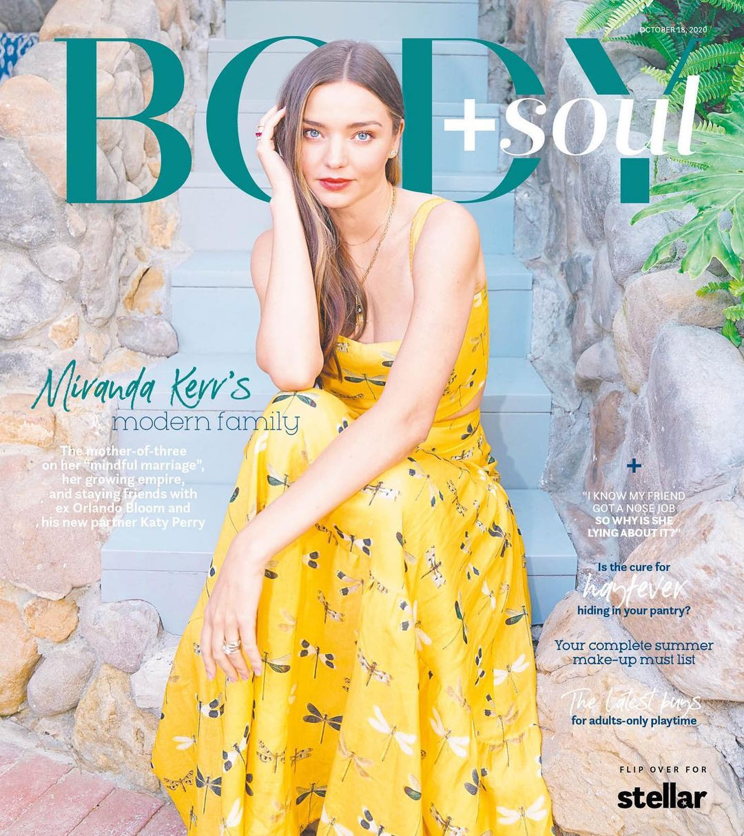 Diện đầm vàng hai dây nền nã, Miranda Kerr vừa trở thành gương mặt trang bìa tạp chí body + soul Úc số mới.