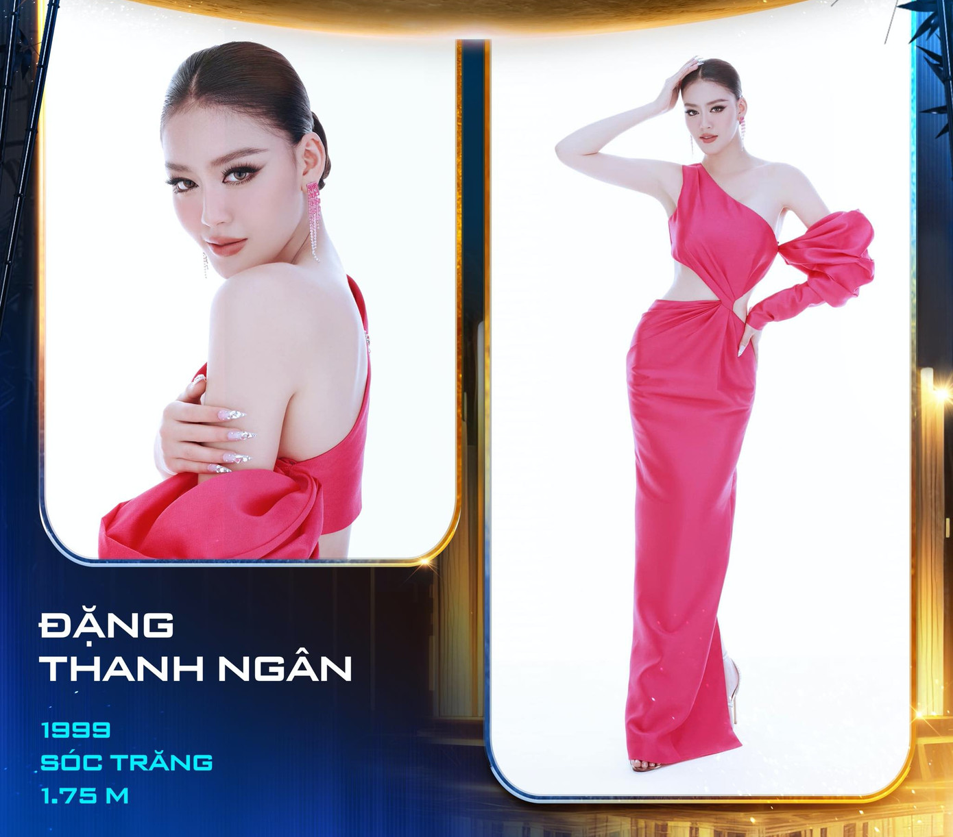 Đặng Thanh Ngân sinh năm 1999, đến từ Sóc Trăng, sở hữu chiều cao 1m75. Người đẹp gây ấn tượng vì từng giành danh hiệu Á hậu 4 Miss Supranational 2023. Trước đó, Thanh Ngân giành danh hiệu Á hậu 2 Hoa hậu Đại dương Việt Nam 2017. Fan sắc đẹp dự đoán Đặng Thanh Ngân chắc chắn sẽ có một vị trí trong Top 16 chung cuộc, thậm chí người đẹp có thể tiến sâu hơn nếu may mắn.