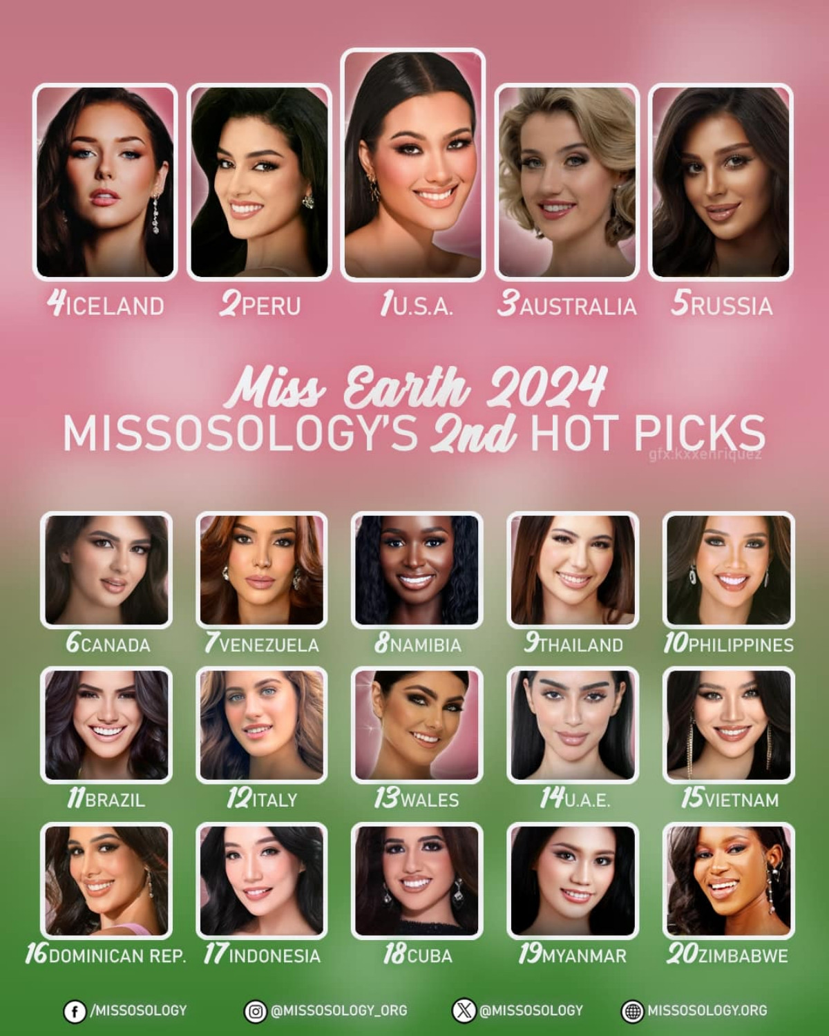 Mới đây, chuyên trang nhan sắc Missosology đã đưa ra BXH lần 2 dành cho cuộc thi Miss Earth 2024. Chuyên trang này dự đoán đại diện đến từ Mỹ sẽ đăng quang, và cũng như các dự đoán trước đó, các đại diện đến từ khu vực châu Á không được đánh giá cao tại cuộc thi năm nay. Trong Top 15 chỉ có 3 đại diện đến từ châu Á bao gồm đại diện Thái Lan được xếp ở vị trí thứ 9, đại diện Philippines ở vị trí thứ 10 và đại diện Việt Nam ở vị trí thứ 15.