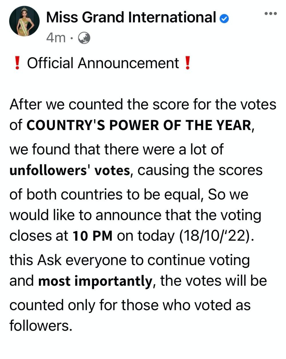 Tại thời điểm kết thúc bình chọn theo dự kiến sáng nay, đại diện Thái Lan tưởng như đã giành thắng lợi. Tuy nhiên, mới đây BTC cuộc thi đã đưa ra thông báo sẽ kéo dài thời gian bình chọn thêm 12 tiếng, lý do là vì có rất nhiều lượt bình chọn sai luật. Theo đúng luật, những bình chọn là follower chính thức của tài khoản Miss Grand International mới được tính. Thế nhưng trong số lượt bình chọn hiện tại của cả hai nàng hậu đều có quá nhiều lượt vote từ những người chưa follow tài khoản của Miss Grand International.