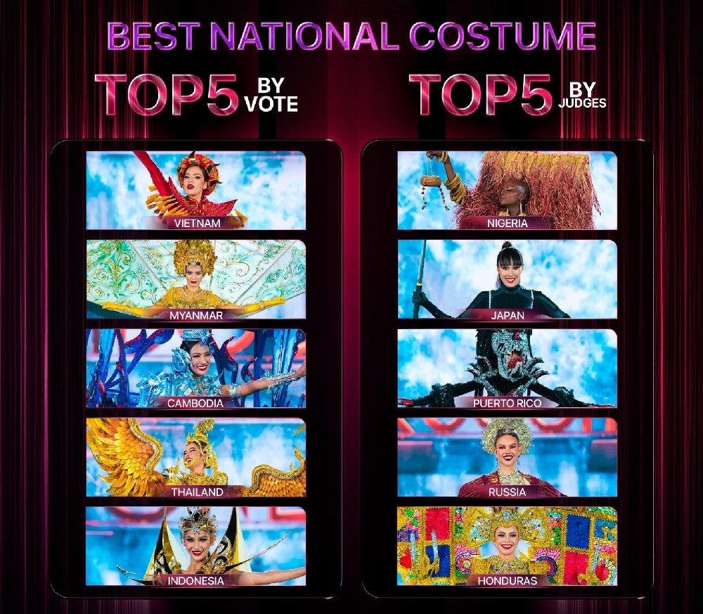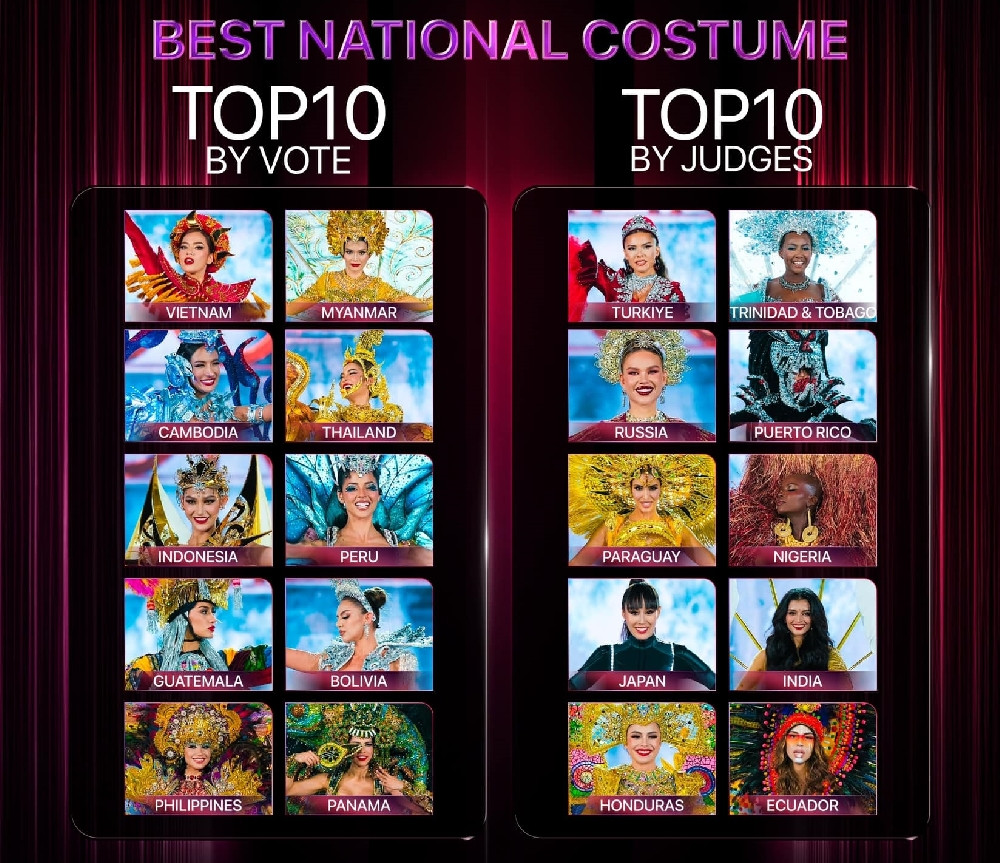 Cũng gần giống như phần thi Best in Swimsuit (trình diễn đồ bơi đẹp nhất), phần thi National Costume (Trang phục Dân tộc) cũng trải qua các vòng bình chọn.