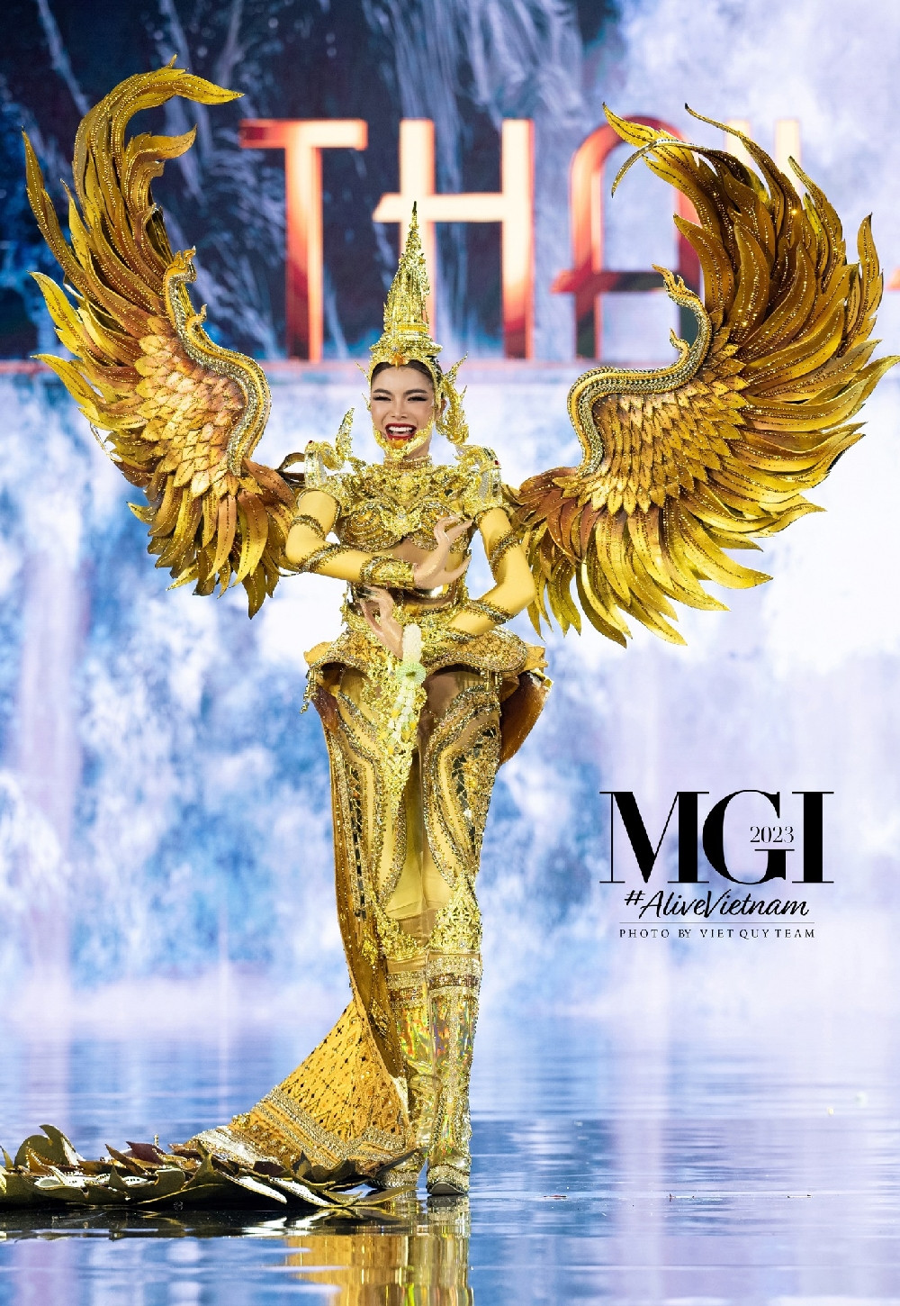 Miss Grand Thailand - Hoa hậu Hòa bình Thái Lan Thaweepon Phingchamrat mang đến thiết kế Garuda Vàng. Garuda là một trong những sinh vật thần bí nổi tiếng nhất tại Thái Lan. Nó quen thuộc và được tôn trọng vì đại diện cho các chính phủ và hoàng gia Thái Lan. Tượng đồng Garuda, được phủ vàng và gương, được đặt tại Wat Phra Kaew, một trong những điểm thu hút du khách nổi tiếng nhất tại Bangkok, đã truyền cảm hứng để tạo ra trang phục này.